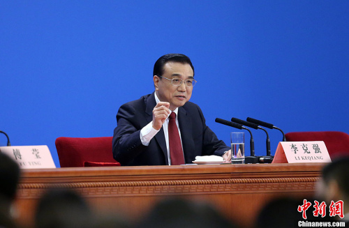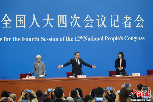 3月16日上午,國務(wù)院總理李克強(qiáng)在人民大會堂三樓金色大廳會見采訪十二屆全國人大四次會議的中外記者,并回答記者提出的問題。中新社記者 金碩 攝