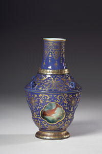 清乾隆磁胎洋彩青地金花魚(yú)游春水瓶