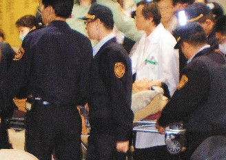 為了避免陳水扁曝光,救護(hù)車直接倒車進(jìn)入急診處把他放下。滿臉胡渣的陳水扁,躺在救護(hù)車的推床上,身體用橘黃色被單蓋著,手、腳未上戒具。他戴著眼鏡躺在推床上,沒有慷慨激昂的高分貝呼喊,他始終緊閉雙眼,不發(fā)一語。