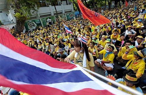 同日下午,數(shù)以萬計“紅衫軍”在曼谷民主紀(jì)念碑附近廣場舉行集會,他們身穿紅衣與穿黃衫的反對派壁壘分明。示威者揮舞國旗,戴寫上“他信”、“不要政變”的紅色頭巾,聲稱支持前首相他信和政府,人數(shù)在當(dāng)?shù)貢r間晚上九時估計至少達(dá)到三萬人。“紅衫軍”領(lǐng)袖表示:“我們齊集在這里以保護(hù)民主政制,我們不希望有政變。”他更稱示威會舉行至十二月四日。