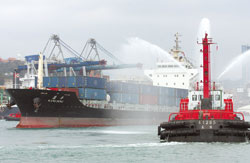 兩岸海運15日全面直航。臺灣基隆港務局在碼頭舉行首航儀式,并派出引水船為首批解纜出航的直航貨輪灑水祝福。(來源:臺灣《中國時報》)