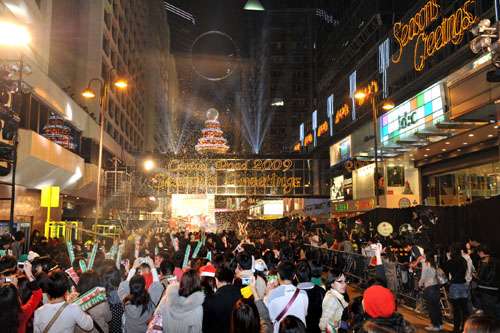 尖沙咀文化中心一帶,不少情侶、年輕人和一家大小戴上圣誕帽和頭飾,拿著閃燈道具,魚貫前往海旁拍攝對(duì)岸燈飾,踏入零時(shí)的一刻,群眾圍住鐘樓自發(fā)倒數(shù)。在人來人往的街道上,間中有詩(shī)歌班獻(xiàn)唱圣詩(shī)報(bào)佳音,市民暫時(shí)停下腳步,放松心情,四處洋溢著歡騰氣氛。至于平日集結(jié)外國(guó)人士的中環(huán)蘭桂坊,今夜不再是白領(lǐng)的天地,家長(zhǎng)帶同子女到該處湊熱鬧,感受一下西方節(jié)日的氣氛。