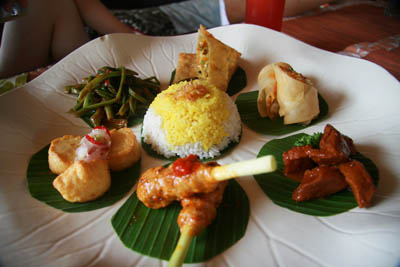 除去烤乳豬之外,多數(shù)的料理都先把材料剁或搗得細(xì)碎,特別是慶典中的必借菜色:蒸什錦(lawar)、沙嗲串烤(sate)和以芭蕉葉包裹的蒸肉丸(tum)。