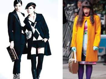 拋開丑女貝蒂的身材不說,這件橙色大衣搭配紫色絲襪還是挺不錯的,對比色運用得很到位,圓頭淑女鞋搭配得也無懈可擊。