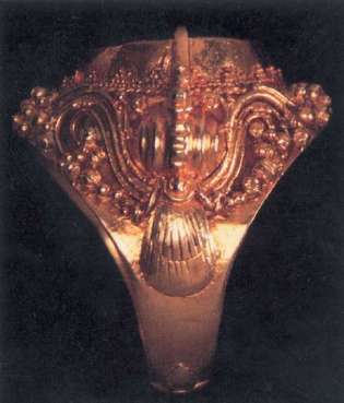 例如附圖的印度黃金指環(huán),工藝甚精美,浮雕圖案富有民族風(fēng)格,獨(dú)特典麗,就是十九世紀(jì)初期的代表作。其實(shí),我國晉代時(shí)也有鏨刻典麗花紋的金指環(huán),當(dāng)然風(fēng)格大相徑庭,但更如鳳毛麟角。