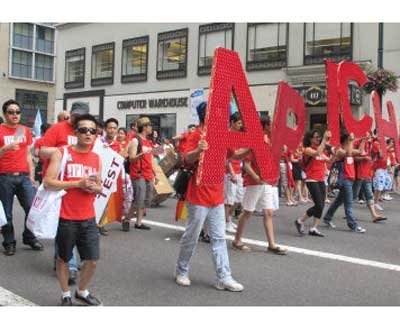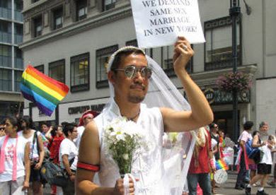 亞裔隊(duì)伍由巨大的彩虹字幅“Asian Pride”打頭陣,數(shù)十人演奏亞洲樂器,吸引民眾注意力,緊隨其后的是專門為亞裔女同志設(shè)立的Q-Wave團(tuán)體!皝喬岚滩÷(lián)盟”(APICHA)主打“免費(fèi)HIV檢測”計(jì)劃,近百位身穿紅色T恤的成員們手舉標(biāo)語,向沿路民眾分發(fā)安全套。很多亞裔同志勇敢展示自己,其中不乏華裔身影。一位身穿結(jié)婚禮服的亞裔男同志,手舉“要求紐約承認(rèn)同性婚姻”的牌子,表達(dá)了同志們的呼聲。也有不少同志的支持者參加游行,梁淑儀支持身為女同志的姐姐梁淑安一起來游行,當(dāng)義工的劉健行和劉素夫婦表示有很多同志朋友,大家都是一樣的人,沒有什么不同。(劉爽)