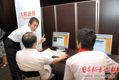 記者在會場上還看見,大和證券為了舉辦此次說明會,準備工作可謂面面俱到?紤]到中午時間,天氣炎熱,參加說明會的在日華人可能來不及吃午飯,大和證券就特意為大家準備了豐盛的盒飯和就餐時間;為了讓參會者對外匯實際操作有一個實際感覺,大和證券在會場一側(cè)設(shè)置了數(shù)臺電腦和最新款式的iPad平板電腦供大家模擬操作,遇到疑難問題,大和證券的員工們給予熱心仔細地解說。