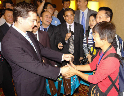 在與杜江等人會(huì)晤后,柏利文也代表哈珀總理,向首發(fā)團(tuán)廣東中旅團(tuán)員致贈(zèng)紀(jì)念品,并一一握手問(wèn)好、寒暄與交談。
