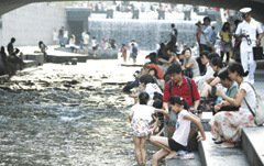 王某一家人從免稅店出來走向清溪川。清溪川是在中國也很有名的旅游景點(diǎn)。雖然是晚間時(shí)分,但天氣依然炎熱。王某的兩個(gè)兒子跳入水中。稍后而來的其他游客也脫掉鞋子進(jìn)入水中。一位游客說:“很涼快,很舒服。孩子們也很喜歡。在城市中心建設(shè)小溪,感到很羨慕!
