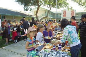 在18日的感恩節(jié)聚會(huì)上,家長們與老師們配合,給孩子送上美味的食品。(蔚宇)