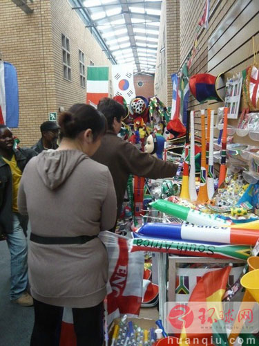 穿行在這里的商鋪之間,安全感和親切感倍增,到處是黃皮膚黑頭發(fā),還有不時會飄送過來的鄉(xiāng)音。商城中的狂歡氣氛相當(dāng)濃重,所有的走道里扎滿了世界杯32強的國旗。商鋪中最受歡迎的也是售賣世界杯相關(guān)商品的,每走幾步,就可以看到許多非華人的買家聚集在售賣球衣、球服、大喇叭的攤位前問價,而站在旁拍照的記者,竟因為長著華人的面孔,被屢屢誤認(rèn)為是老板,遭問了不下十幾次“這個值多少錢?”實際上,世界杯官方的球衣和紀(jì)念品幾乎全都是中國制造的,當(dāng)然,百家商城里出售的商品多數(shù)是沒有授權(quán)的“山寨版”,比正版貨的價格便宜數(shù)倍,因此南非各地的人,也有不少專程跑到中國城來批發(fā)便宜貨?磥恚澜绫帜茏屇戏侨A人大賺一筆了。(底婕)