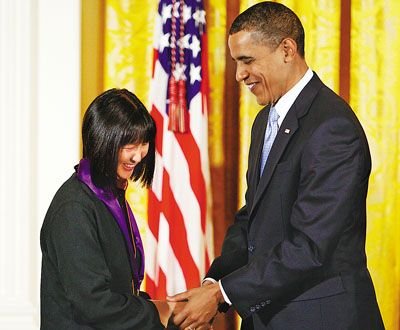 中新網(wǎng)2月27日電 據(jù)美國《世界日?qǐng)?bào)》報(bào)道,20歲那年設(shè)計(jì)華盛頓越戰(zhàn)紀(jì)念碑而一夜成名的華裔建筑師林瓔(Maya Lin),當(dāng)?shù)貢r(shí)間25日晚在白宮獲奧巴馬總統(tǒng)頒發(fā)2009年國家藝術(shù)獎(jiǎng)?wù)。林瓔這項(xiàng)成功的設(shè)計(jì)已和美國歷史融為一體。