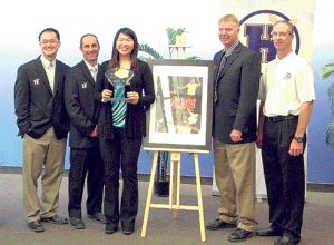 葉惠恩(中)與她的教練鄭學(xué)林(左一)、Mike Kopinak(左二)及OCAA行政總監(jiān)Blair Webster(右一)和坎伯學(xué)院運動體育總監(jiān)Doug Fox頒獎后合影。(加拿大《星島日報》)