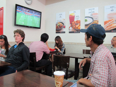 不少球迷早已準(zhǔn)備好享受這場(chǎng)足球盛宴,據(jù)美國《星島日?qǐng)?bào)》報(bào)道,紐約下東城不少酒吧、餐廳甚至小區(qū)團(tuán)體早已準(zhǔn)備了看球場(chǎng)地,以吸引顧客。華埠地威臣街“香港站”快餐店門外的大餐牌早早的就換成世界杯賽事的中英文海報(bào)和賽程細(xì)表,店內(nèi)兩部寬屏的液晶電視,輪流播著不同體育節(jié)目。
