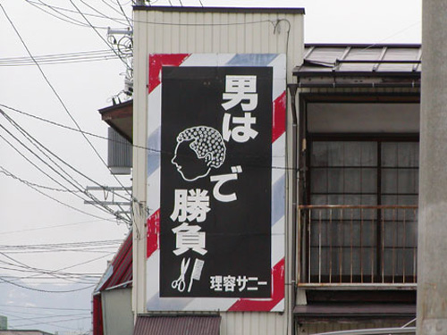 還有一回走過附近一家料理店,上面貼出的紙頭上寫的是“為了強化腸胃,去熱海集體宿營!” 比這個更絕的是鄉(xiāng)下的一家理發(fā)店,上面寫的是“男人憑腦袋瓜分勝負”,而這個腦袋瓜沒用漢字寫,生往上畫了一個卷毛兒的腦袋瓜,