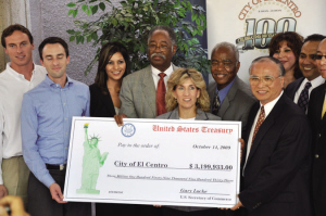 中新網(wǎng)10月16日電 據(jù)美國《僑報(bào)》報(bào)道,美國經(jīng)濟(jì)蕭條還沒有走出低谷,聯(lián)邦財(cái)政預(yù)算捉襟見肘。14日在帝王郡艾爾森特市政府(El Centro, Imperial County)舉行頒獎(jiǎng)典禮,聯(lián)邦商務(wù)部經(jīng)濟(jì)發(fā)展局(EDA)表彰華裔開發(fā)商美國YK集團(tuán)(YK America Group),對(duì)美國經(jīng)濟(jì)和創(chuàng)造就業(yè)的貢獻(xiàn),并獎(jiǎng)勵(lì)給他們由商務(wù)部長(zhǎng)駱家輝簽名的320萬美元支票,用于商業(yè)開發(fā)區(qū)水電和道路的基礎(chǔ)建設(shè)。