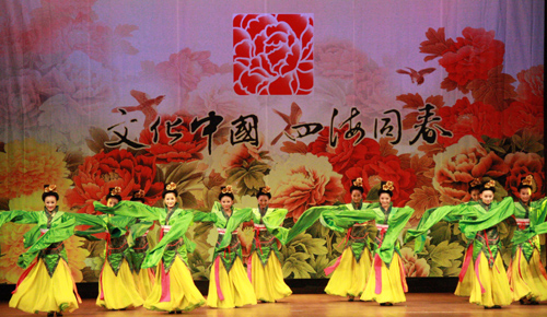 晚會以開場舞《花開中華大團(tuán)圓》開始,苗族舞蹈《春暖花開》、蒙古族舞蹈《奔騰》、彝族舞蹈《阿西里西》等充滿民族風(fēng)情的舞蹈,為觀眾展示了中華民族大家庭豐富多彩的特色文化。國家一級演員劉維維和魏金棟今晚為觀眾精心演繹了《草原上升起不落的太陽》、《為祖國干杯》、《可愛的一朵玫瑰花》和《北國之春》等經(jīng)典曲目,讓現(xiàn)場僑胞或沉醉,或激動。最后登場的集體舞《千手觀音》則讓觀眾一睹這一著名節(jié)目的風(fēng)采,引發(fā)了觀眾們的熱烈反響。將現(xiàn)場氣氛推向高潮。