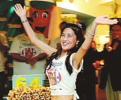李蕙在競吃場內的知名度迅速提升。她在2007年第一次參加紐約國慶節(jié)吃熱狗大賽中,12分鐘內吃掉26根熱狗,名列第十。去年,她則以10分鐘吃掉42根熱狗的成績向前沖,成為成績最佳女選手。今年7月4日她再次在熱狗大賽中亮相,吞下34根熱狗后表示今年只是量力而行,順利完成自己制定的個人目標。