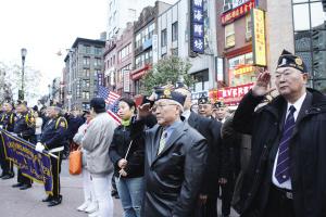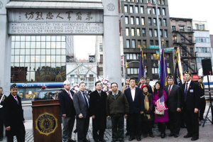 下午,紐約華裔美國(guó)退伍軍人會(huì)在華埠華裔軍人忠烈坊舉行另一個(gè)紀(jì)念儀式--向華裔軍人獻(xiàn)上花圈,呼吁人們勿忘華裔軍人對(duì)美國(guó)作出的貢獻(xiàn)。