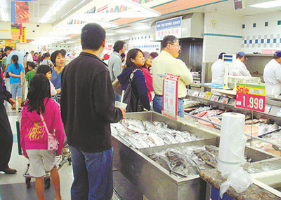 亞資超市目前也配合時令,主打火鍋料理,除肉片、丸子自成專柜,海鮮部門前消費者川流不息。(王善言)