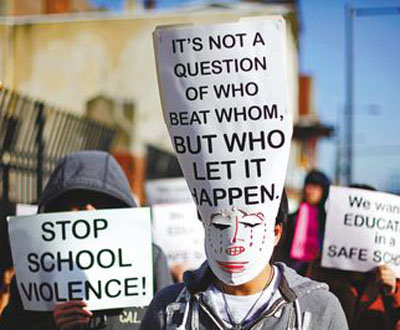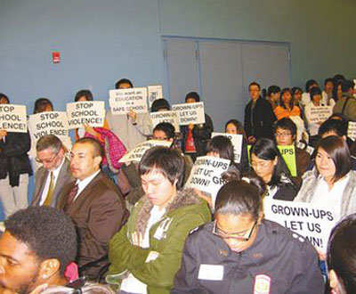 南費(fèi)城高中亞裔學(xué)生、家長(zhǎng)和華埠小區(qū)領(lǐng)袖百余人,9日下午手持“是誰(shuí)讓它發(fā)生”等抗議標(biāo)語(yǔ),游行至教育局參加公聽(tīng)會(huì),游行者高喊“停止學(xué)校暴力”、“給我安全教育環(huán)境”,抒發(fā)壓抑多時(shí)的不滿。