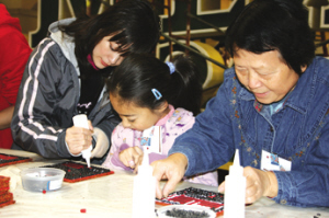 副會(huì)長(zhǎng)鹿強(qiáng)當(dāng)天全家上陣,包括岳父岳母和妻子兒女在內(nèi)的一家六口全都來到了粘花現(xiàn)場(chǎng),一起為世博會(huì)花車中國(guó)館模型粘貼由紅豆和黑豆組成的吉祥圖案,岳父方先生一邊干活一邊表示,能為世博會(huì)花車出一份力,這是他們?nèi)业淖院馈?/p>