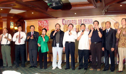 而為了感謝這份來自祖國的慰問,表達(dá)對藝術(shù)家們的歡迎,當(dāng)?shù)氐拿耖g團(tuán)體“愛華文藝社”的成員們,也奉獻(xiàn)出了自己最拿手的節(jié)目。他們一個個精心打扮、盛裝出場,認(rèn)真的態(tài)度一點都不含糊。只見中華通惠總局主席蕭孝權(quán)換上了軍裝、戴上了假胡子,扮起了《沙家浜》中的吳司令;就連中國駐秘魯大使趙五一也和僑胞們打成了一片,頭上扎了白毛巾,扮起陜北的老農(nóng)民,唱起了《游擊隊之歌》,他們精彩的節(jié)目贏得了所有觀眾的笑聲與掌聲,令晚會一次次高潮迭起。