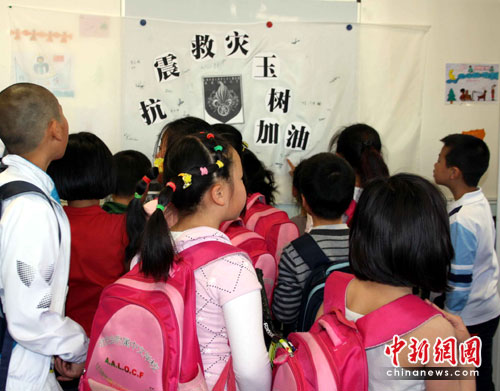 周六下午,是孩子們常規(guī)上中文課的時間。下課的鈴聲一響,孩子們就把自己的零用錢裝進(jìn)信封,一個接一個地放進(jìn)捐款箱,然后在寫著"抗震救災(zāi) 玉樹加油"的橫幅上寫下自己的名字,有些會寫中文的孩子還寫上了“加油”二字。一筆筆稚嫩的筆跡代表著一份份純真的愛心。