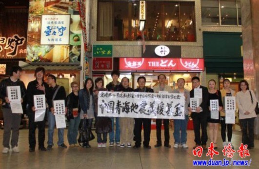 災(zāi)情就是命令!災(zāi)難無情,人間有愛!4月22日(星期四),愛媛松山一大早下起了多年未見的瓢潑大雨,但愛媛縣的同胞和日本友人仍然按照約定的時(shí)間,冒著大雨毅然走上街頭,開始了由聯(lián)合會(huì)帶頭部署倡導(dǎo)的聲勢(shì)浩大的街頭募捐活動(dòng)。由三十多人組成的募捐隊(duì)伍,彼此不分中國人還是日本人,用真心與熱情共同譜寫、詮釋人間大愛——心向玉樹,情系災(zāi)區(qū)!四幅由聯(lián)合會(huì)副會(huì)長、旅日山水畫家牛子華即時(shí)揮毫寫就的《愛媛縣華僑華人聯(lián)合會(huì) 中國留學(xué)生學(xué)友會(huì) 日中友好協(xié)會(huì):為中國青海地震義援募金》的巨大橫幅在指定地點(diǎn)拉開了,募捐隊(duì)伍懷抱著十多個(gè)由聯(lián)合會(huì)事務(wù)局準(zhǔn)備的專用募捐箱,拉開了活動(dòng)的序幕!鞍萃袨橹袊嗪5卣馂(zāi)區(qū)獻(xiàn)愛心”的募捐聲,聲聲入耳。向來對(duì)救災(zāi)特別熱情的日本國民開始駐足慷慨解囊……和兩年前祖國汶川大地震賑災(zāi)募捐情景同樣感人的一幕再次在同一地點(diǎn)重新演繹。我們禁不住熱淚盈眶——祈福災(zāi)區(qū)人民!衷心感謝熱情、善良、友好的人們!第一天共募集到58,700日元。