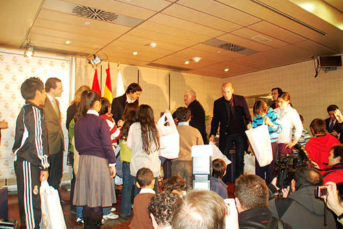 中新網(wǎng)12月26日電 據(jù)西班牙《歐華報》報道,由皇馬基金會發(fā)起“每個孩子都有玩具”的活動,日前在馬德里伯納烏球場內(nèi)舉行;蜀R現(xiàn)役超級球星卡卡,及退役球星齊達內(nèi)到場給馬德里兒童代表送出“第一份”圣誕節(jié)禮物。毛尚雅等4名華裔小朋友作為馬德里華僑子女代表,參觀了皇馬博物館、伯納烏球場及球員休息室等地,并在活動中上臺領(lǐng)取禮物,接受電視臺采訪。