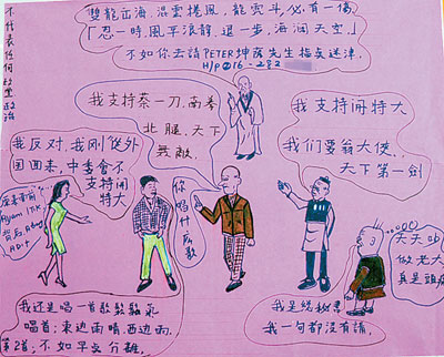 張貼在飲食中心周圍的有關(guān)漫畫大字報(bào)顏色非常鮮艷,內(nèi)容都是以“馬華武林大會(huì)”、“支持特大”、“翁大使要第一劍”、“中委會(huì)不支持特大”、及“雙龍出海,混云卷風(fēng),龍虎斗,必有一傷”,及勸人退一步海闊天空等字眼。