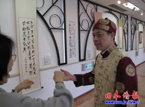 這位濃眉大眼的大漢,是湖南岳陽(yáng)人,眉宇間有一股坦蕩之氣逼人?傋尮P者懷疑是武林中人。就是這位,自2001年來日本傳播指書文化,短短10年間,已是列島上下,上至國(guó)家政要,下至普通市民,爭(zhēng)相結(jié)交的人氣者。