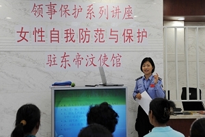 中新網(wǎng)4月26日電 據(jù)中國外交部網(wǎng)站消息,4月25日,中國駐東帝汶使館在簽證大廳舉辦領(lǐng)事保護(hù)系列講座第二講,題為“女性自我防范與保護(hù)”,由中國派駐東帝汶維和警隊(duì)的何育芳女警官和聯(lián)合國世界糧食計(jì)劃署駐東帝汶辦公室副主任趙欣敏女士聯(lián)合主講。除僑胞外,傅元聰大使夫婦和使館婦女小組全體成員也出席了講座。