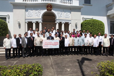 菲律賓商聯(lián)總會理事長黃禎潭、菲華各界聯(lián)合會主席戴宏達(dá)一行4日上午來到中國駐菲使館,親手向劉建超大使遞交了由這兩個菲華社團發(fā)動當(dāng)?shù)厝A人華僑為玉樹災(zāi)區(qū)籌得的善款3287.7萬比索(約合500萬元人民幣)。
