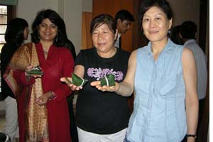 許多印度朋友只知道中國有春節(jié),知道春節(jié)前夕家家戶戶都要吃餃子,卻并不了解端午節(jié)對中國人的意義。小組成員李鈺和戴燕霞向印度朋友詳細(xì)講述了愛國詩人屈原的故事和端午節(jié)的來歷,以及后人為紀(jì)念他堅(jiān)持了兩千多年的包粽子、賽龍舟的傳統(tǒng)習(xí)俗,感動(dòng)了在場的每位印度友人。