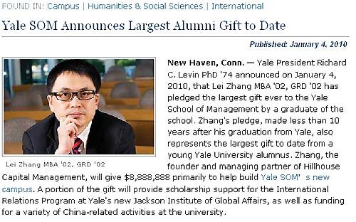 據(jù)耶魯大學公共事務(wù)辦公室網(wǎng)站1月4日消息,美國耶魯大學校長理查德·萊文教授宣布,耶魯2002屆畢業(yè)生張磊(音)已經(jīng)承諾,將向耶魯大學管理學院(SOM)捐贈888萬8888美元。這是到目前為止,耶魯管理學院畢業(yè)生捐贈的最大一筆個人捐款。