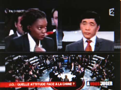 先看一看曲星公使面對(duì)的陣勢(shì):政府人權(quán)事務(wù)國(guó)務(wù)秘書拉瑪·亞德、前社會(huì)黨總理法比、主張抵制北京奧運(yùn)會(huì)的田徑運(yùn)動(dòng)員協(xié)會(huì)代表和對(duì)中國(guó)抱有極深偏見(jiàn)的《解放報(bào)》主編約弗蘭,再加上操縱輿論的主持人:以一敵五。4月7日法國(guó)5臺(tái)辯論節(jié)目《巴黎無(wú)圣火》上,鄭若麟一人面對(duì)四人,董純4月13日在《報(bào)亭》參加的辯論會(huì)上共有一名主持人和五名外國(guó)駐法記者,而站在公正立場(chǎng)上的只有一位非洲記者,等于也是一對(duì)四。從一開始,他們就處在這樣的陣勢(shì)中。