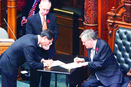 中新網(wǎng)11月1日電 據(jù)加拿大《明報》報道,競選連任成功的加拿大安省省長麥堅迪10月30日率領新內(nèi)閣宣誓就任。華裔省議員陳國治再上層樓,被麥堅迪委以重任,出任安省公民及移民廳廳長,成為安省內(nèi)閣的一名重要成員。陳國治在宣誓就任的儀式結(jié)束后向中文媒體表示,感謝省長給他這個機會,可以為安省的新移民、新公民服務。