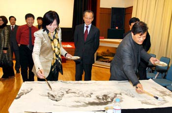 全日本華人書法家協(xié)會(huì)主席劉洪友代表藝術(shù)家們感謝使館舉辦溫馨親切的元宵節(jié)招待會(huì),感謝使館長(zhǎng)期以來(lái)對(duì)海外藝術(shù)家的支持。他呼吁大家廣集才智、團(tuán)結(jié)一心,為祖國(guó)的進(jìn)一步繁榮昌盛貢獻(xiàn)自己的力量。劉洪友還特別提到了今年國(guó)內(nèi)南方的雨雪冰凍災(zāi)害,倡議大家關(guān)心災(zāi)區(qū),并以“在日華人文聯(lián)籌委會(huì)”的名義,帶頭捐款,為災(zāi)區(qū)獻(xiàn)上了一份愛心。