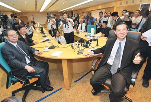 林冠英以檳州首長(zhǎng)身份,第一次在首長(zhǎng)辦公樓召開(kāi)記者會(huì)。(馬來(lái)西亞《光華日?qǐng)?bào)》圖)