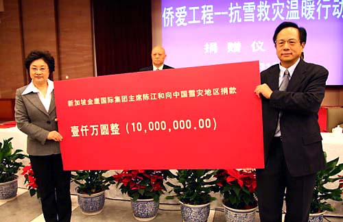1月中旬以來,中國南方大部分地區(qū)遭遇五十年不遇的低溫、雨雪和冰凍天氣,造成7786.2萬人受災(zāi),直接經(jīng)濟(jì)損失220.9億元。在這種情況下,新成立的中國僑商投資企業(yè)協(xié)會響應(yīng)國務(wù)院僑辦發(fā)起的“僑愛溫暖行動”,向廣大僑商發(fā)起“抗雪救災(zāi),溫暖行動”的緊急倡議書。中國僑商投資企業(yè)協(xié)會常務(wù)副會長、新加坡金鷹國際集團(tuán)主席陳江和先生聞訊第一個響應(yīng),捐贈1000萬元人民幣用于抗災(zāi)。