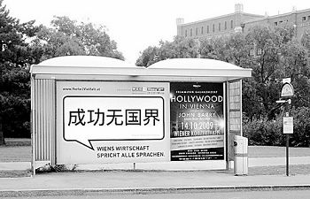 近日,奧地利維也納街頭出現(xiàn)了一些漢字廣告。隨著中國國際影響的增加,奧地利人對中國的關(guān)注度和對中國文化的興趣也在不斷上升。維也納大學(xué)漢學(xué)系的學(xué)生從中國改革開放前的約50人激增到現(xiàn)在的約700人;奧地利的漢語教學(xué)機構(gòu)從維也納大學(xué)漢學(xué)系1家增加到現(xiàn)在的約70家;通過各種方式學(xué)習(xí)漢語的有數(shù)千人。當(dāng)?shù)亟逃块T已在考慮將漢語列入中學(xué)的教學(xué)大綱。正是在這一背景下,漢字廣告牌出現(xiàn)在維也納街頭。圖為10月8日維也納南火車站旁一個公共車站的廣告牌,上面張貼著維也納商會的廣告“成功無國界”。(方祥生 攝)