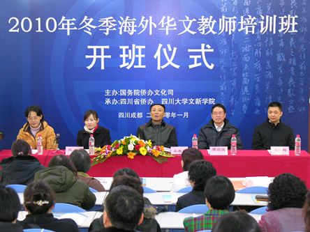 中新網1月6日電 據四川僑網消息,1月6日,由國務院僑辦文化司主辦,四川省僑辦和四川大學承辦的2010年冬季海外華文教師培訓班在四川大學開班。這是四川省僑務系統(tǒng)首次承辦海外華文教師培訓班。四川省僑辦副主任吳振西、四川大學文學與新聞學院院長曹順慶出席開班儀式并致辭。四川大學文學與新聞學院黨委書記熊蘭主持儀式。