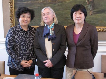 中國駐法國使館教育處公參朱小玉、一秘劉京玉考察讓松·德塞伊中學(xué)時,與校長安妮·弗雷斯蒂埃在一起。(黃冠杰 攝)