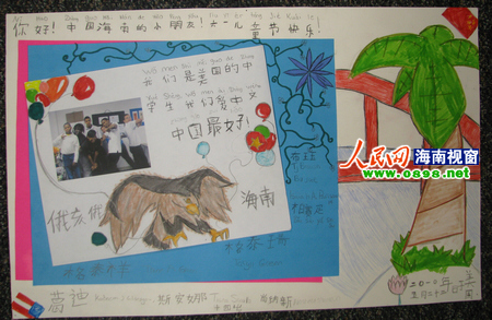 記者從任老師提供的圖片上看到,在卡片的上部,寫(xiě)著“你好!中國(guó)海南的小朋友!六一兒童節(jié)快樂(lè)!”的字樣,卡片的左下角畫(huà)著一個(gè)美國(guó)國(guó)旗代表美國(guó),右上角畫(huà)著一個(gè)中國(guó)國(guó)旗代表中國(guó),卡片中央畫(huà)著一只雄鷹作為美國(guó)的象征,雄鷹的嘴里銜著兩端系滿五彩氣球的絲線,絲線將“俄亥俄”和“海南”連接起來(lái),在雄鷹的上方,寫(xiě)著“我們是美國(guó)的中學(xué)生,我們愛(ài)中文,中國(guó)最好”并貼著卡片作者的照片?ㄆ覀(cè)的椰子樹(shù)代表海南,在海南和俄亥俄之間,架起了一座象征友誼的大橋。卡片右下角的時(shí)間顯示,這張祝福卡制作于當(dāng)?shù)貢r(shí)間5月22日。