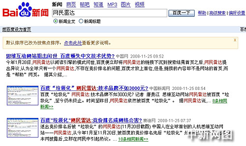 從25日的截圖可以看到,在百度新聞搜索輸入關(guān)鍵詞“網(wǎng)民雷達(dá)”,質(zhì)疑百度“垃圾化”網(wǎng)民雷達(dá)的新聞及媒體轉(zhuǎn)載情況赫然入目,但是,24日的《思維互動網(wǎng)站狙擊問世 百度頓失中文技術(shù)優(yōu)勢?》一文,在谷歌可見至少有新浪、中國網(wǎng)、和訊、21cn、金融界等多個(gè)網(wǎng)站轉(zhuǎn)載,但在百度卻全被屏蔽。只有25日中國網(wǎng)刊登的這篇文章得以幸存。