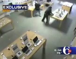 從監(jiān)控錄像看,5名劫匪破窗而入,頭部蒙著面罩,進(jìn)店后便瘋狂開搶。整個搶劫過程僅持續(xù)了31秒鐘,有23部MacBook Pros筆記本,14部iPhone(iPhone玩家論壇)手機(jī)和9部iPod被搶。