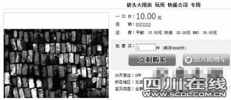 隨后,記者在淘寶上搜索,發(fā)現(xiàn)了近20家“磚頭大甩賣”的網(wǎng)店。店家在產(chǎn)品詳情上都寫著“磚頭大甩賣,玩死快遞公司專用”等字樣。記者發(fā)現(xiàn),這些網(wǎng)店大多以經(jīng)營其他商品為主,“賣磚頭”只是副業(yè)。只有極個(gè)別的店鋪里“只賣磚頭”,但是除了幾十個(gè)瀏覽記錄外,并沒有人購買。