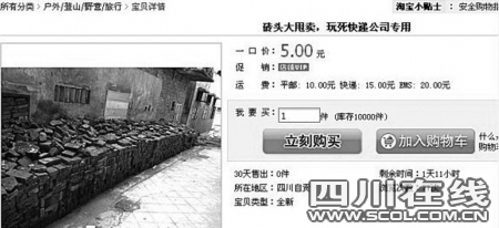 近日,店主“千尋kission”在淘寶網(wǎng)上發(fā)布了“磚頭大甩賣,玩死快遞公司專用”的銷售標(biāo)題,表示將以5元一斤的價(jià)格販賣磚頭。其中的產(chǎn)品說明還頗有幾分《武林外傳》中呂秀才的風(fēng)采:“泄憤也可用磚頭,本磚頭專為對付那些服務(wù)態(tài)度不好的快遞送貨員設(shè)計(jì),如果你們對那些惹您生氣的快遞員投訴無門,無處泄憤請拍下此產(chǎn)品!