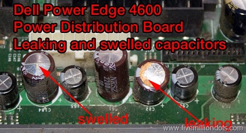第一臺(tái)是PowerEdge 4600托管服務(wù)器,首先是四個(gè)熱插拔電源之中的一個(gè)出現(xiàn)問題,導(dǎo)致服務(wù)器宕機(jī)。拆除問題電源后,利用其他三個(gè)電源繼續(xù)運(yùn)轉(zhuǎn)了9個(gè)月時(shí)間。結(jié)果又有一個(gè)電源出現(xiàn)問題。打開機(jī)箱后發(fā)現(xiàn),控制電源系統(tǒng)的主板部分的電容器出現(xiàn)了膨脹,泄露。